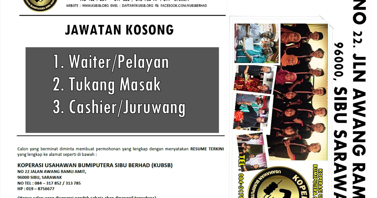 Koperasi Usahawan Bumiputera Sibu Berhad Kubsb Jawatan Kosong Waiter Cashier Tukang Masak Kerja Kosong Di Sibu Sarawak