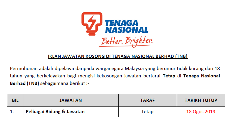 Jawatan Kosong Di Tenaga Nasional Berhad Tnb 25 Disember 2018 Kerja Kosong 2020 Jawatan Kosong Kerajaan 2020